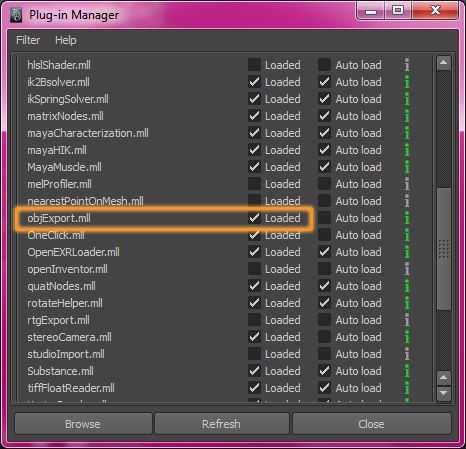 This window will pop up. Find objExport.mll and check the box next to Loaded. You can also check Auto load, if you want to load the OBJ plug-in every time Maya starts.
