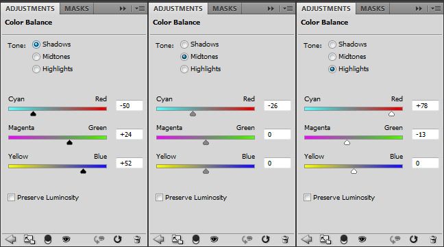Below, you can see the settings I used for the Color Balance. There are separate settings for the Shadows, Midtones, and Highlights of the image.